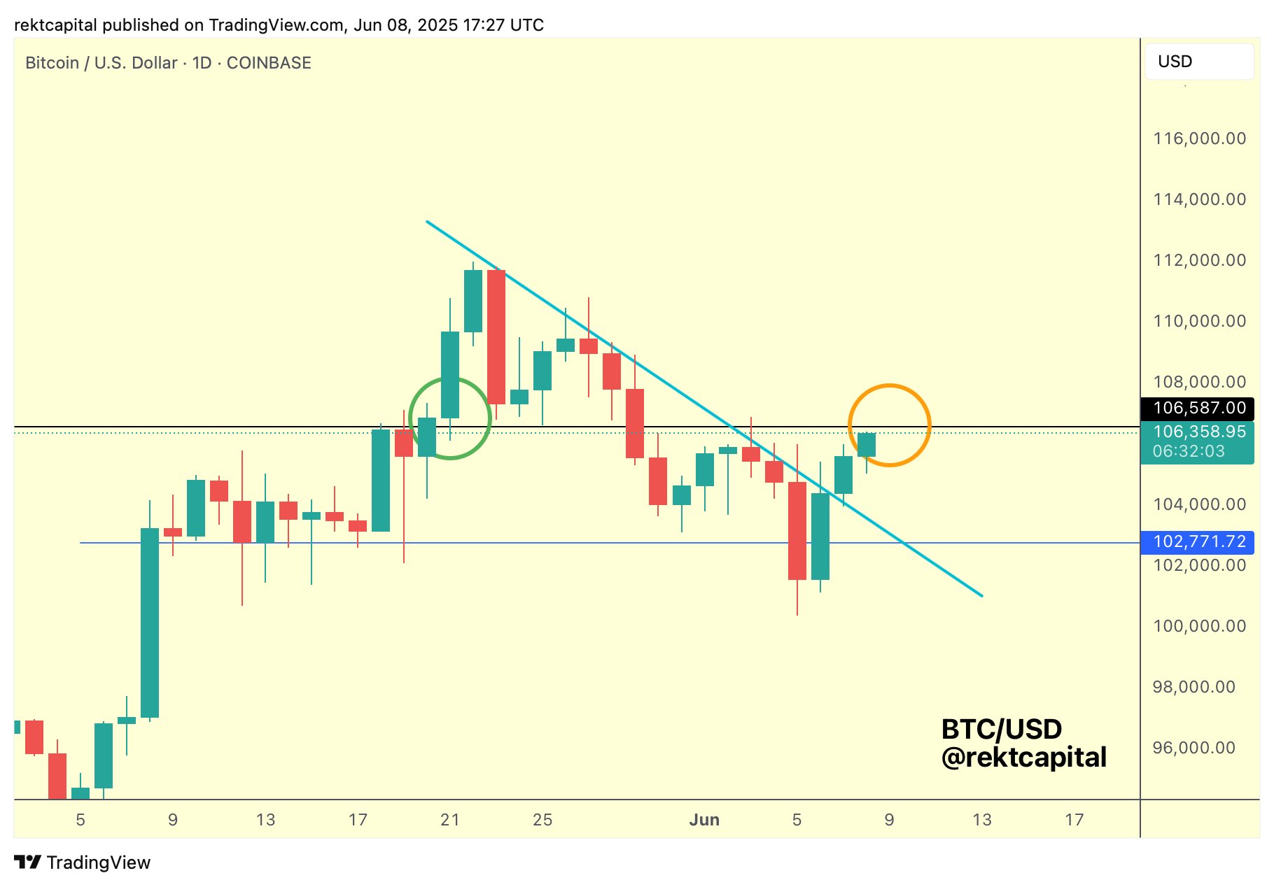 Yatırımcı ve analist Rekt Capital’e göre, sonuçlar karışıktır, çünkü 104.400 $ seviyesi geçerli kalır ve BTC/USD arka arkaya dördüncü haftadaki artışın kapatılmasını sağlar, ancak bir boğa pazarı henüz yapılmamıştır.